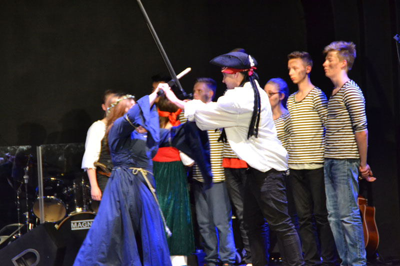 Die Idee reifte seit Beginn der 8. Jahrgangsstufe. Damals entschloss sich die Klasse 8e, ein Theaterstück auf die Bühne zu bringen. Grundlage waren hierfür Otfried Preußlers „Krabat“ und der Film „Fluch der Karibik“. Eine Kombination aus beidem wurde „Krabat of the Caribbean“. Seit Beginn des aktuellen Schuljahres arbeitete die Klasse 9e gemeinsam an der Umsetzung. Dies bedeutete jede Woche zusätzliche Zeit für das Proben aufbringen, Texte lernen, sich über Kulissen Gedanken machen, Power-Point-Präsentationen erstellen und Sprech- und Schauspieltraining nehmen. Unterstützung erhielten die Schülerinnen und Schüler von der Werken-AG, die die Kulissen realisierte und von der Schulband und dem Schulchor, die die musikalische Ausgestaltung des Stückes übernahmen.