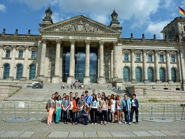 Am 09.07.2013 machten sich schließlich 21 Redakteure, darunter 5 aus anderen Fürther Schulen, sowie die betreuenden Lehrkräfte unserer LURCH auf die zweitägige Reise in die Landeshauptstadt. Zwar bedeutete dies für die meisten bereits um 02:00 Uhr morgens aufzustehen, doch hatte sich dies mehr als gelohnt. Nach über fünf Stunden Fahrt mit dem Bus erwartete uns ein Highlight nach dem anderen. Frau Heimbach und Herr Schmidt schnürten nämlich ein Paket, das für (junge) Zeitungsredakteure keine Wünsche offen ließ. Auf dem Programm standen neben der Erkundung des Bundeskanzleramtes, des Verteidigungsministeriums und des Reichstagsgebäudes natürlich auch Besuche namhafter Einrichtungen, die mit dem Journalismus zu tun hatten. So gewährte uns beispielsweise Stephan Scherzer, Hauptgeschäftsführer des VDZ, Einblicke in die Arbeit des Verbandes Deutscher Zeitschriftenverleger. Aber auch Sabine Heimbachs Arbeitsstätte, das Bundespresseamt, wurde inspiziert. Zu guter Letzt durften wir den legendären Axel-Springer-Verlag, der ja in engster Verbindung mit dem Namenspatron unserer Schule – Leopold Ullstein – steht, erkunden.