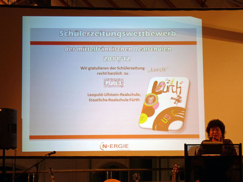 Johann Seitz, Ministerialbeauftragter für die Realschulen in Mittelfranken, überreichte letztendlich die Urkunde für den 1. Platz und die obligatorische Tafel (siehe LURCH-Schaukasten). Auf und neben der Bühne durften die Anwesenden unserer Redaktion ein Blitzlichtgewitter der Presse und der Nürnberger N-ERGIE (Sponsor des Wettbewerbs) erleben. Für ein paar Minuten fühlten sich alle ein wenig wie Stars. Ein leckeres Buffet rundete die gelungene Veranstaltung ab.