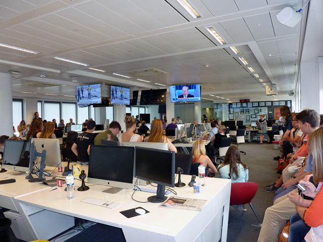 Nach der Besichtigung des sich im 19. Stock des Gebäudes befindlichen Journalistenclubs erwartete uns eine außerordentliche und für die meisten wohl einmalige Attraktion in ihrem Leben: Wir durften an der Redaktionskonferenz der BILD-Zeitung teilnehmen. Live mitzuerleben, wie eine der bekanntesten Zeitungen Deutschlands für ihr Erscheinen am Folgetag vorbereitet wird, ist schon ein besonderes Erlebnis gewesen. Letztendlich sollte dieses Event noch gekrönt werden, als eine spontane Fotoaktion mit dem Showmaster und Wetten-dass-Erfinder Frank Elstner – welcher wohl weniger wegen uns vor Ort war – stattfand. Am 10.07. machten sich dann 24 überwältigte, aber völlig geschaffte Schülerzeitungsredakteure und Lehrer auf den Heimweg. Geblieben sind jede Menge großartiger Eindrücke von einer großartigen Stadt, die mehr zu bieten hat als den Fernsehturm und die berühmte Curry-Wurst.
