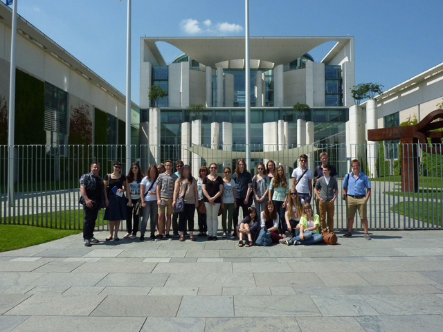 Am 09.07.2013 machten sich schließlich 21 Redakteure, darunter 5 aus anderen Fürther Schulen, sowie die betreuenden Lehrkräfte unserer LURCH auf die zweitägige Reise in die Landeshauptstadt. Zwar bedeutete dies für die meisten bereits um 02:00 Uhr morgens aufzustehen, doch hatte sich dies mehr als gelohnt. Nach über fünf Stunden Fahrt mit dem Bus erwartete uns ein Highlight nach dem anderen. Frau Heimbach und Herr Schmidt schnürten nämlich ein Paket, das für (junge) Zeitungsredakteure keine Wünsche offen ließ. Auf dem Programm standen neben der Erkundung des Bundeskanzleramtes, des Verteidigungsministeriums und des Reichstagsgebäudes natürlich auch Besuche namhafter Einrichtungen, die mit dem Journalismus zu tun hatten. So gewährte uns beispielsweise Stephan Scherzer, Hauptgeschäftsführer des VDZ, Einblicke in die Arbeit des Verbandes Deutscher Zeitschriftenverleger. Aber auch Sabine Heimbachs Arbeitsstätte, das Bundespresseamt, wurde inspiziert. Zu guter Letzt durften wir den legendären Axel-Springer-Verlag, der ja in engster Verbindung mit dem Namenspatron unserer Schule – Leopold Ullstein – steht, erkunden.
